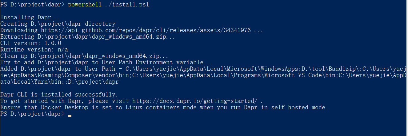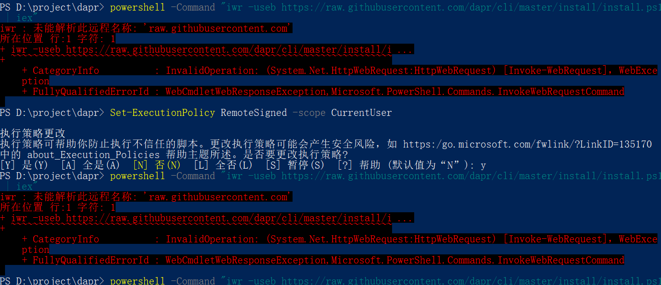 windows 上安装 dapr 遭遇问题 通过官网命令安装 dapr 报错如下  解决方案 如下: ``` # ------------------------------------------------------------ # Copyright (c) Microsoft Corporation and Dapr Contributors. # Licensed under the MIT License. # ------------------------------------------------------------ param ( [string]$Version, [string]$DaprRoot = "c:\dapr" ) Write-Output "" $ErrorActionPreference = 'stop' #Escape space of DaprRoot path $DaprRoot = $DaprRoot -replace ' ', '` ' # Constants $DaprCliFileName = "dapr.exe" $DaprCliFilePath = "${DaprRoot}\${DaprCliFileName}" # GitHub Org and repo hosting Dapr CLI $GitHubOrg = "dapr" $GitHubRepo = "cli" # Set Github request authentication for basic authentication. if ($Env:GITHUB_USER) { $basicAuth = [System.Convert]::ToBase64String([System.Text.Encoding]::ASCII.GetBytes($Env:GITHUB_USER + ":" + $Env:GITHUB_TOKEN)); $githubHeader = @{"Authorization" = "Basic $basicAuth" } } else { $githubHeader = @{} } if ((Get-ExecutionPolicy) -gt 'RemoteSigned' -or (Get-ExecutionPolicy) -eq 'ByPass') { Write-Output "PowerShell requires an execution policy of 'RemoteSigned'." Write-Output "To make this change please run:" Write-Output "'Set-ExecutionPolicy RemoteSigned -scope CurrentUser'" break } # Change security protocol to support TLS 1.2 / 1.1 / 1.0 - old powershell uses TLS 1.0 as a default protocol [Net.ServicePointManager]::SecurityProtocol = "tls12, tls11, tls" # Check if Dapr CLI is installed. if (Test-Path $DaprCliFilePath -PathType Leaf) { Write-Warning "Dapr is detected - $DaprCliFilePath" Invoke-Expression "$DaprCliFilePath --version" Write-Output "Reinstalling Dapr..." } else { Write-Output "Installing Dapr..." } # Create Dapr Directory Write-Output "Creating $DaprRoot directory" New-Item -ErrorAction Ignore -Path $DaprRoot -ItemType "directory" if (!(Test-Path $DaprRoot -PathType Container)) { throw "Cannot create $DaprRoot" } # Get the list of release from GitHub $releases = Invoke-RestMethod -Headers $githubHeader -Uri "https://api.github.com/repos/${GitHubOrg}/${GitHubRepo}/releases" -Method Get if ($releases.Count -eq 0) { throw "No releases from github.com/dapr/cli repo" } # Filter windows binary and download archive if (!$Version) { $windowsAsset = $releases | Where-Object { $_.tag_name -notlike "*rc*" } | Select-Object -First 1 | Select-Object -ExpandProperty assets | Where-Object { $_.name -Like "*windows_amd64.zip" } if (!$windowsAsset) { throw "Cannot find the windows Dapr CLI binary" } $zipFileUrl = $windowsAsset.url $assetName = $windowsAsset.name } else { $assetName = "dapr_windows_amd64.zip" $zipFileUrl = "https://github.com/${GitHubOrg}/${GitHubRepo}/releases/download/v${Version}/${assetName}" } $zipFilePath = $DaprRoot + "\" + $assetName Write-Output "Downloading $zipFileUrl ..." $githubHeader.Accept = "application/octet-stream" $zipFileUrl="https://github.com/dapr/cli/releases/download/v1.0.0/dapr_windows_amd64.zip" Invoke-WebRequest -Uri $zipFileUrl -OutFile $zipFilePath # Invoke-WebRequest -Headers $githubHeader -Uri $zipFileUrl -OutFile $zipFilePath if (!(Test-Path $zipFilePath -PathType Leaf)) { throw "Failed to download Dapr Cli binary - $zipFilePath" } # Extract Dapr CLI to $DaprRoot Write-Output "Extracting $zipFilePath..." Microsoft.Powershell.Archive\Expand-Archive -Force -Path $zipFilePath -DestinationPath $DaprRoot if (!(Test-Path $DaprCliFilePath -PathType Leaf)) { throw "Failed to download Dapr Cli archieve - $zipFilePath" } # Check the Dapr CLI version Invoke-Expression "$DaprCliFilePath --version" # Clean up zipfile Write-Output "Clean up $zipFilePath..." Remove-Item $zipFilePath -Force # Add DaprRoot directory to User Path environment variable Write-Output "Try to add $DaprRoot to User Path Environment variable..." $UserPathEnvironmentVar = [Environment]::GetEnvironmentVariable("PATH", "User") if ($UserPathEnvironmentVar -like '*dapr*') { Write-Output "Skipping to add $DaprRoot to User Path - $UserPathEnvironmentVar" } else { [System.Environment]::SetEnvironmentVariable("PATH", $UserPathEnvironmentVar + ";$DaprRoot", "User") $UserPathEnvironmentVar = [Environment]::GetEnvironmentVariable("PATH", "User") Write-Output "Added $DaprRoot to User Path - $UserPathEnvironmentVar" } Write-Output "`r`nDapr CLI is installed successfully." Write-Output "To get started with Dapr, please visit https://docs.dapr.io/getting-started/ ." Write-Output "Ensure that Docker Desktop is set to Linux containers mode when you run Dapr in self hosted mode." ``` 然后执行如下命令安装: ```powershell .\install.ps1``` 欧克了 亲测 截图为证